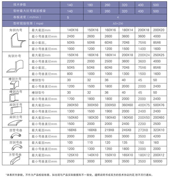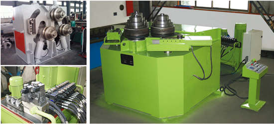 型材彎曲機性能特點: 該彎曲機的兩下輥為主傳動輥,也可三個工作輥為主傳動輥,兩個邊輥圍繞固定回轉中心作弧線升降運動,兩側設有托輥裝置,有利于保證非對稱截面型材卷制質量。本機結構先進,工作可靠,體積小,功能齊全,是目前國內先進的型材成型設備。機器可配置結構先進的通用或專用模具。